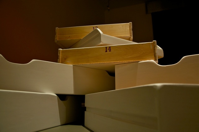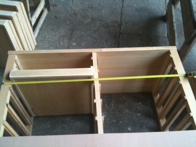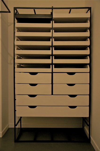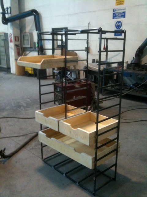 It resulted in an iron parallelepiped with many bones (= i.e. the guides of the drawers) + a central vertical rigid bar which is suspended and it works for guide for the half (= smaller) drawers. At first impact it can be considered not that much important, but it really is the most interesting part of the furniture: since it’s got no bottom joint there’s a risk fot it to weave. But it’s been made with criterium so…no risk! 🙂