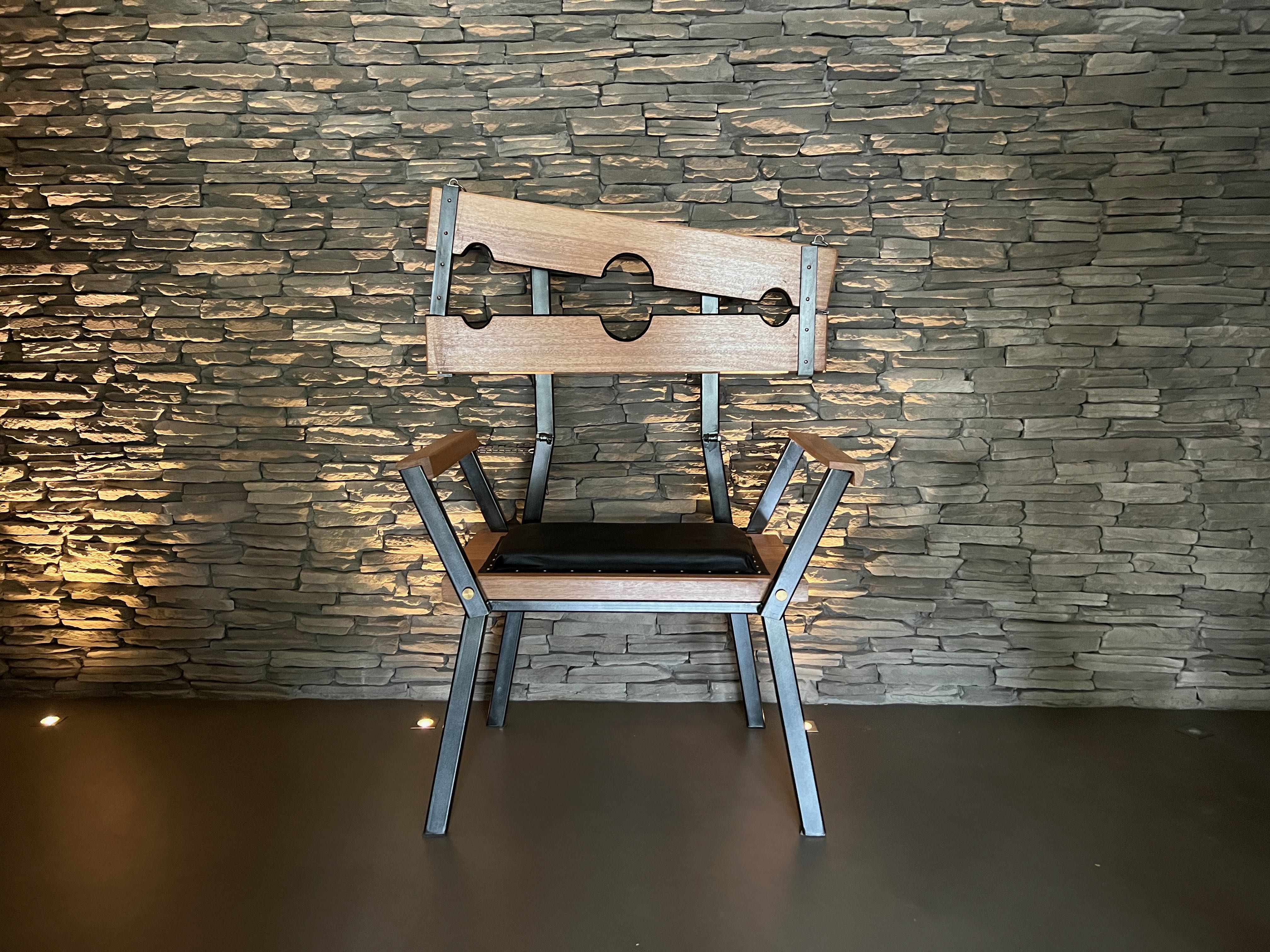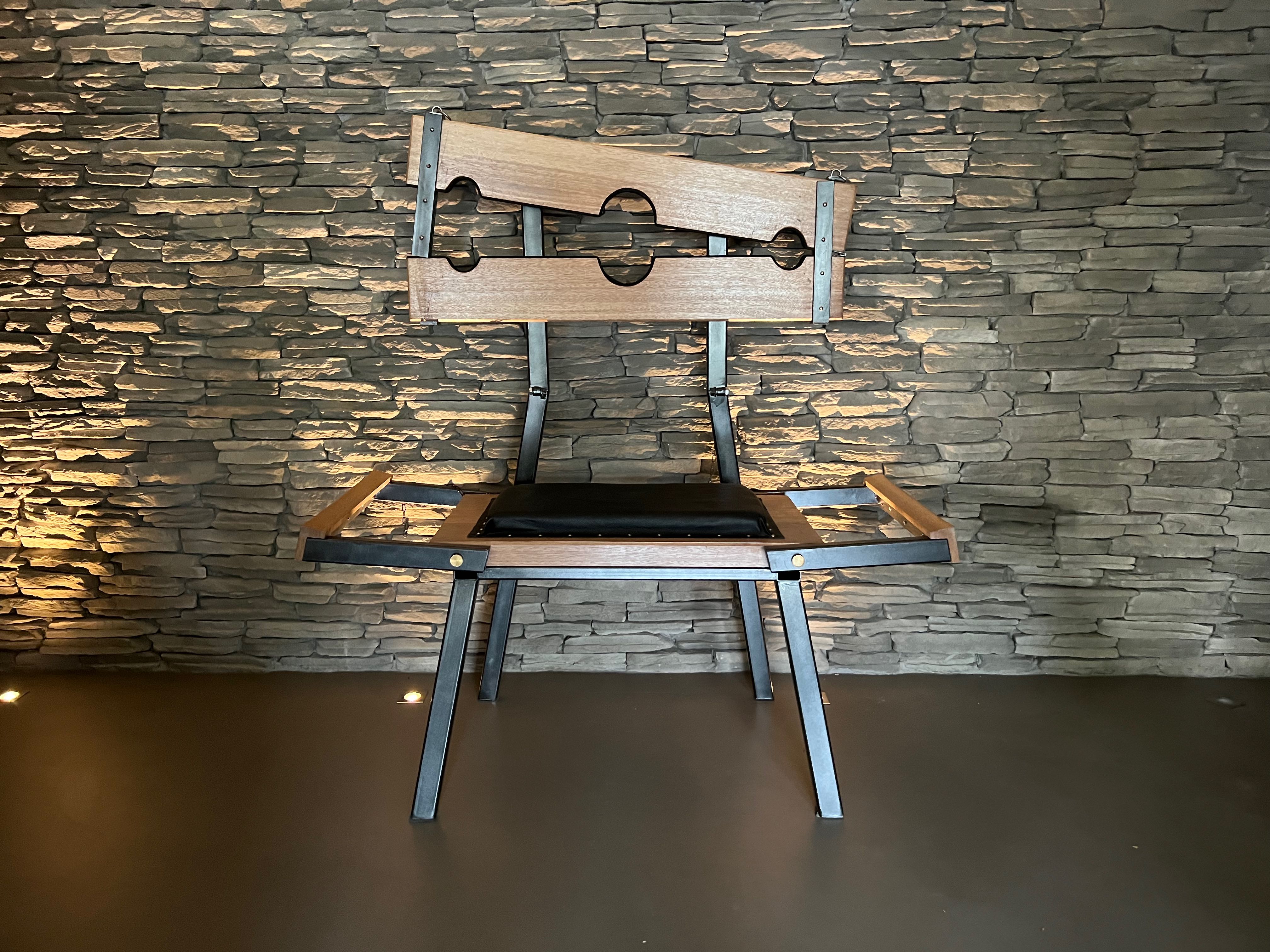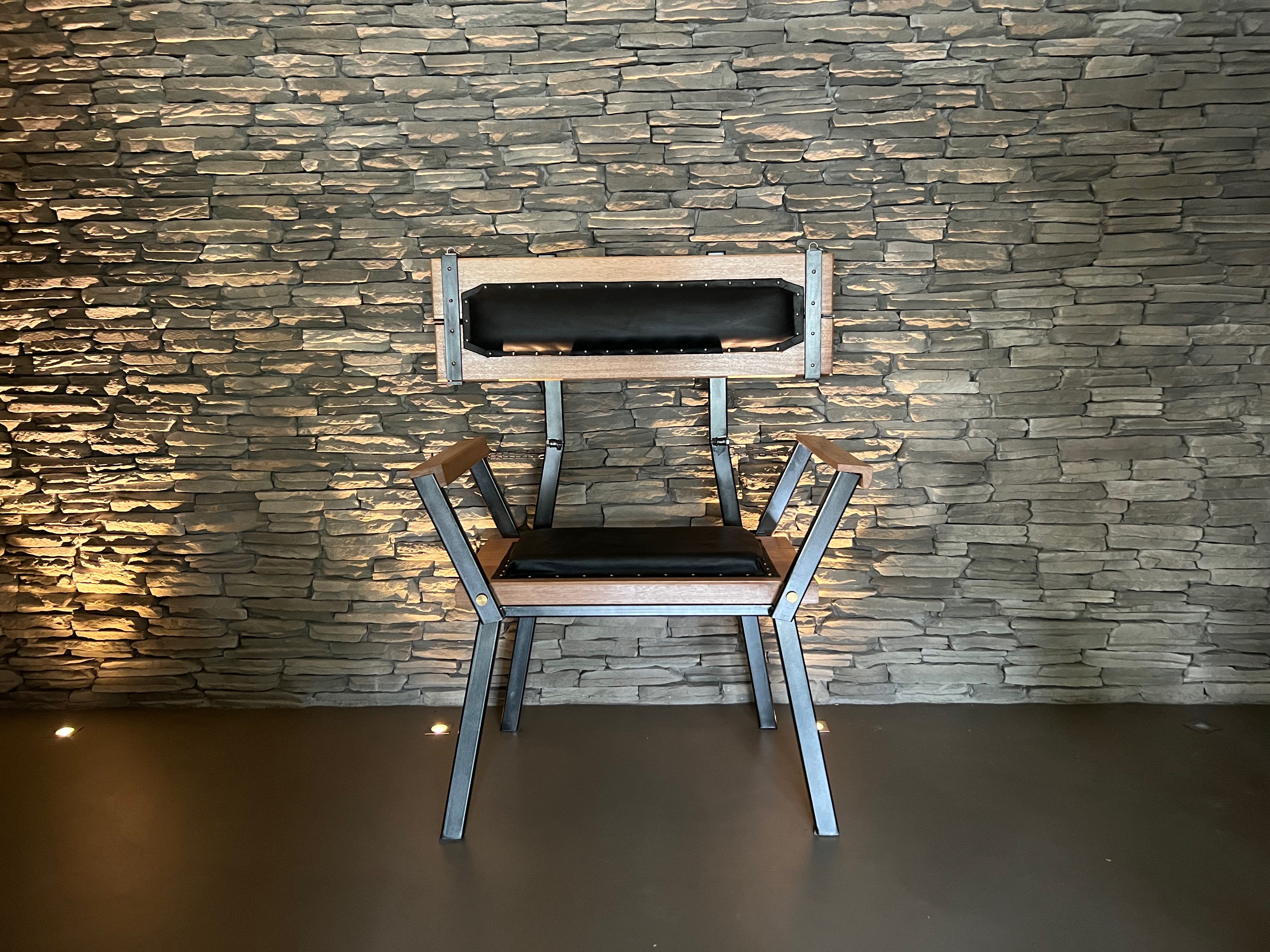 Materials: steel, walnut wood, cotton, leather, neoprene