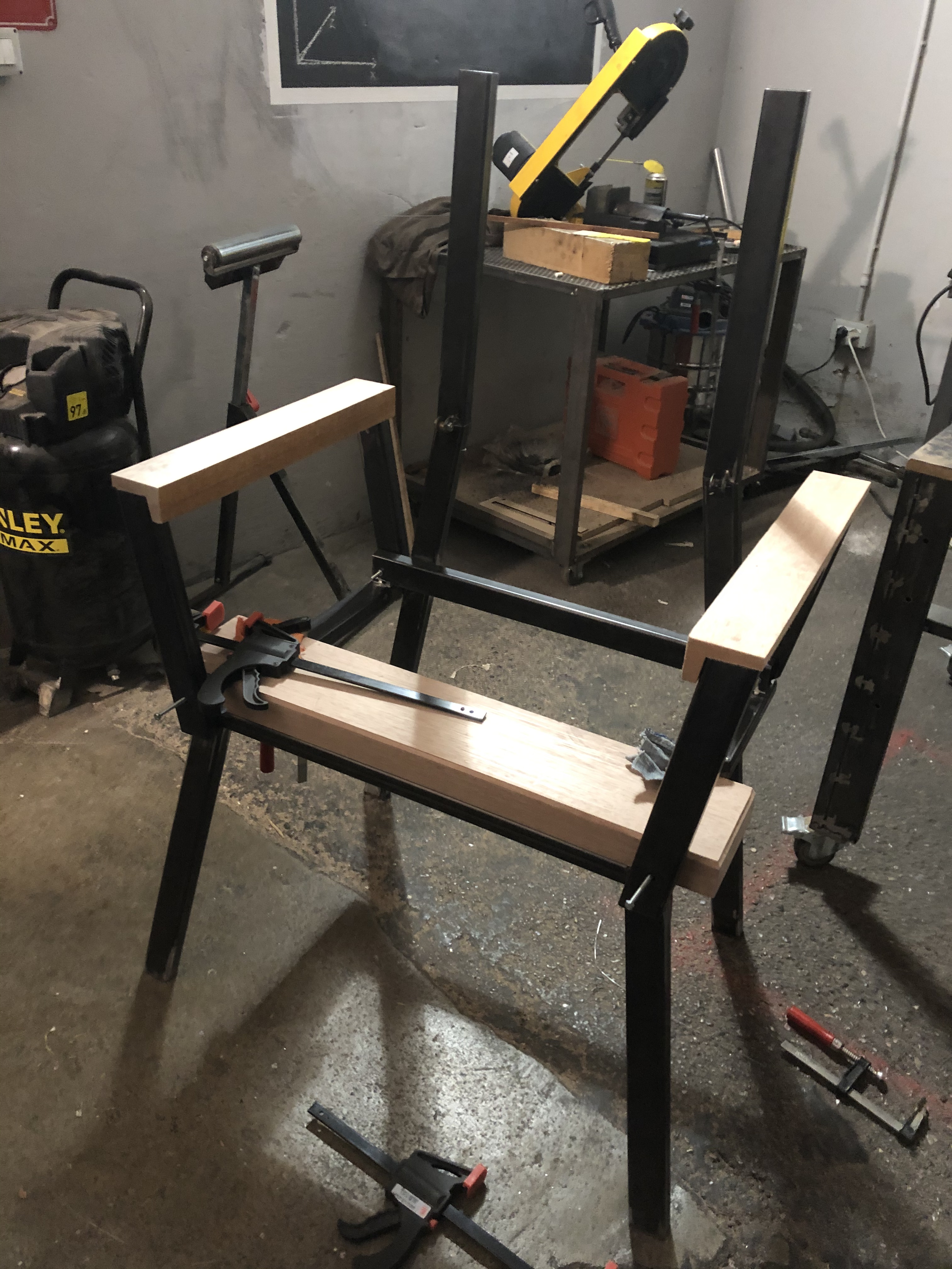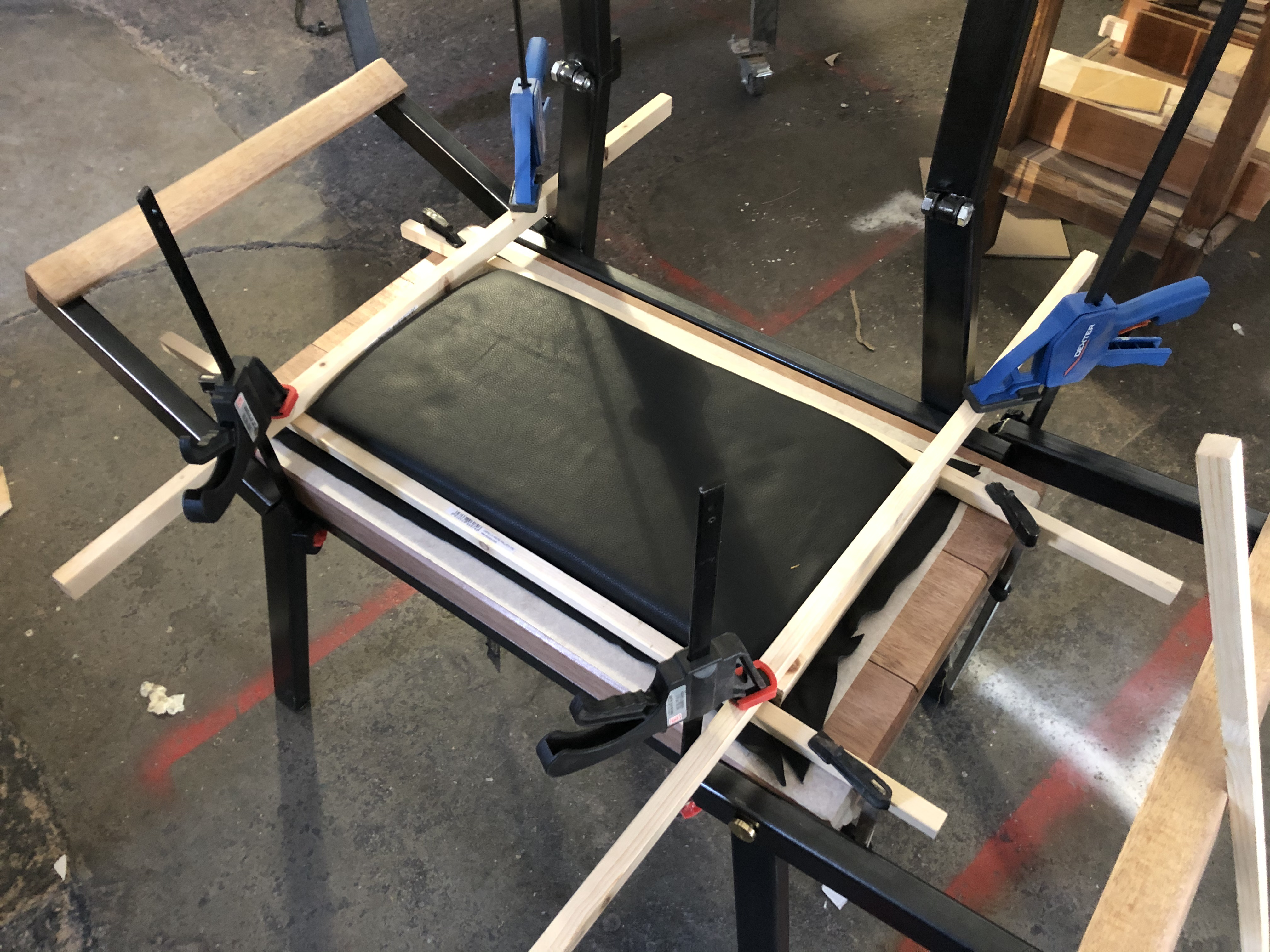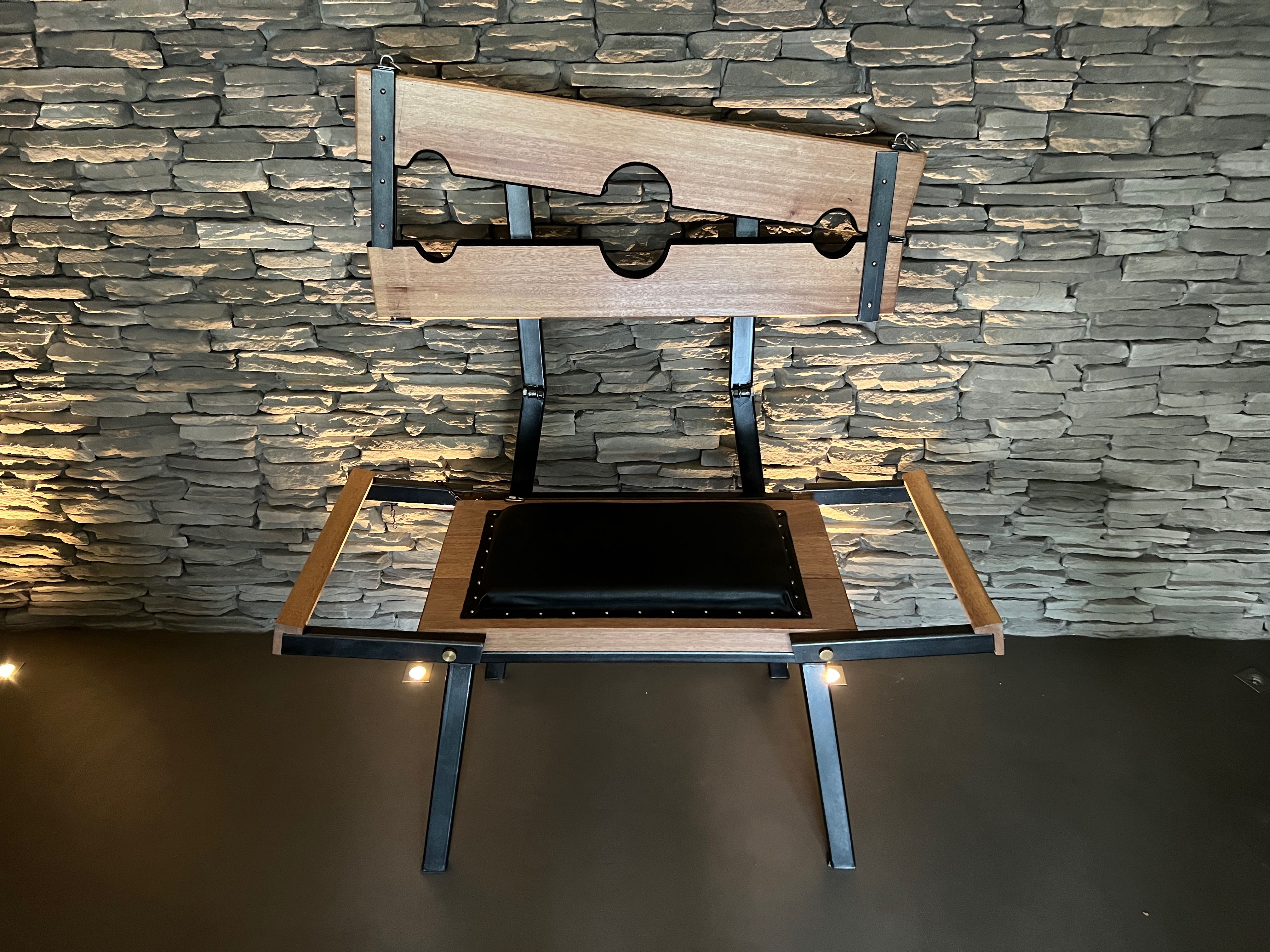 Materials: steel, walnut wood, cotton, leather, neoprene
