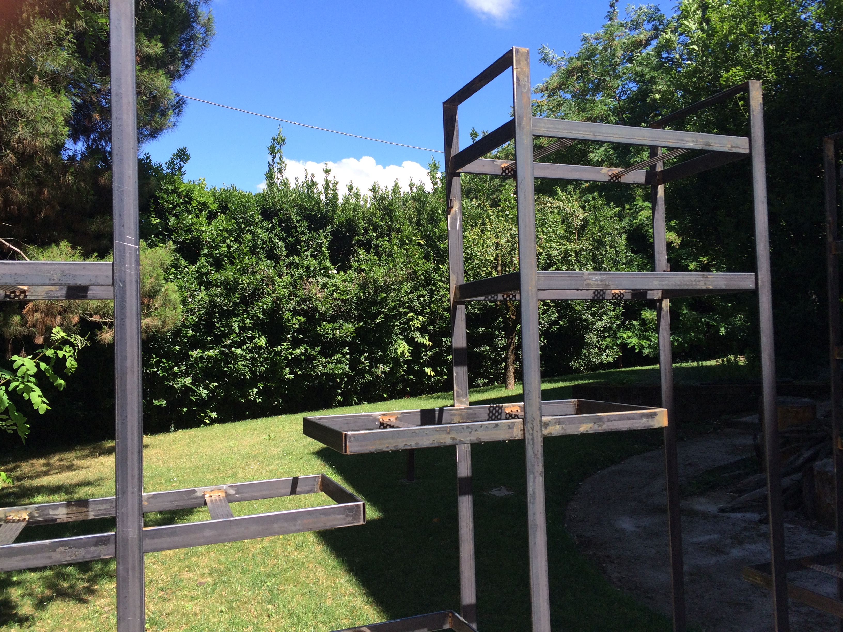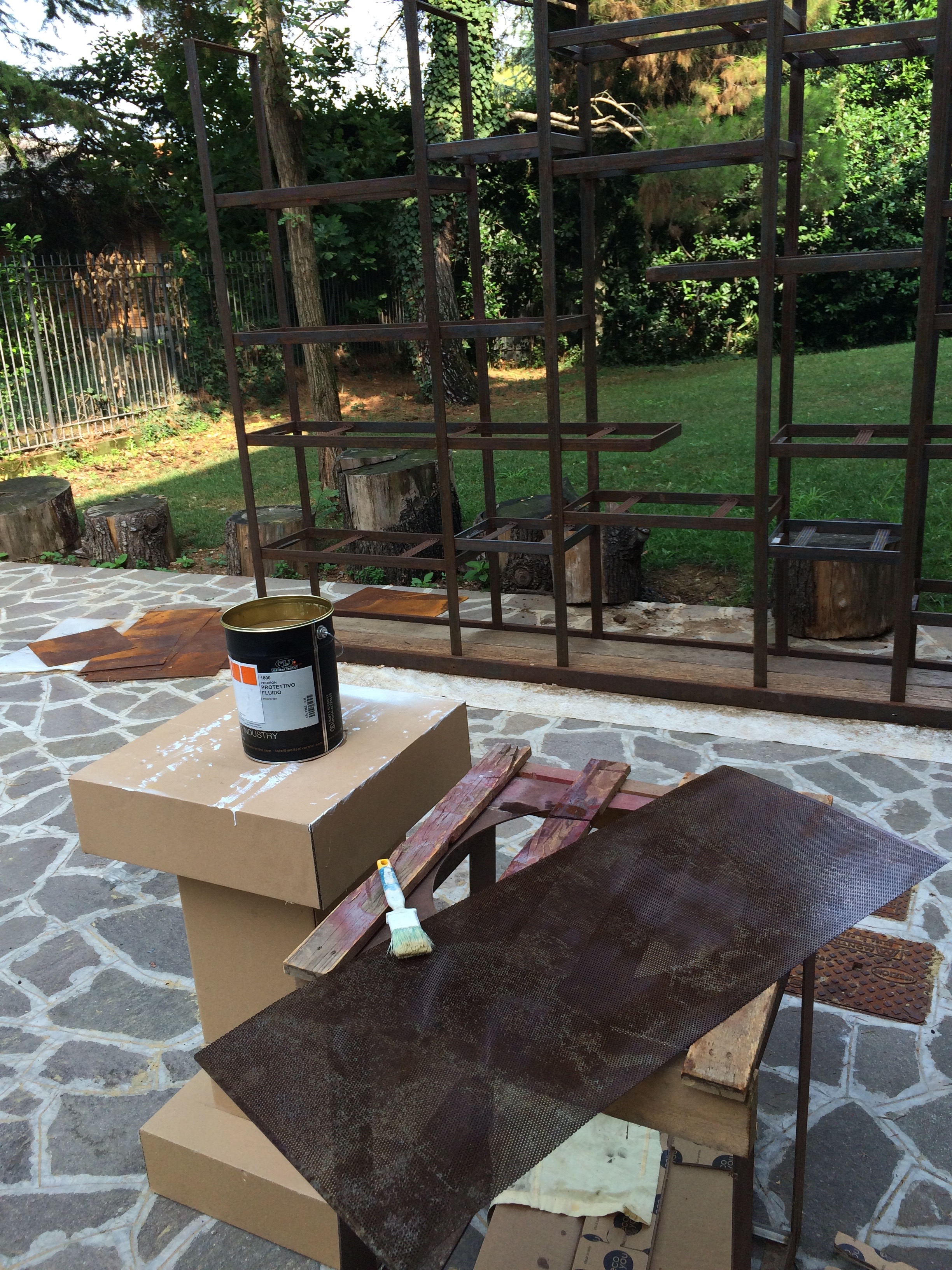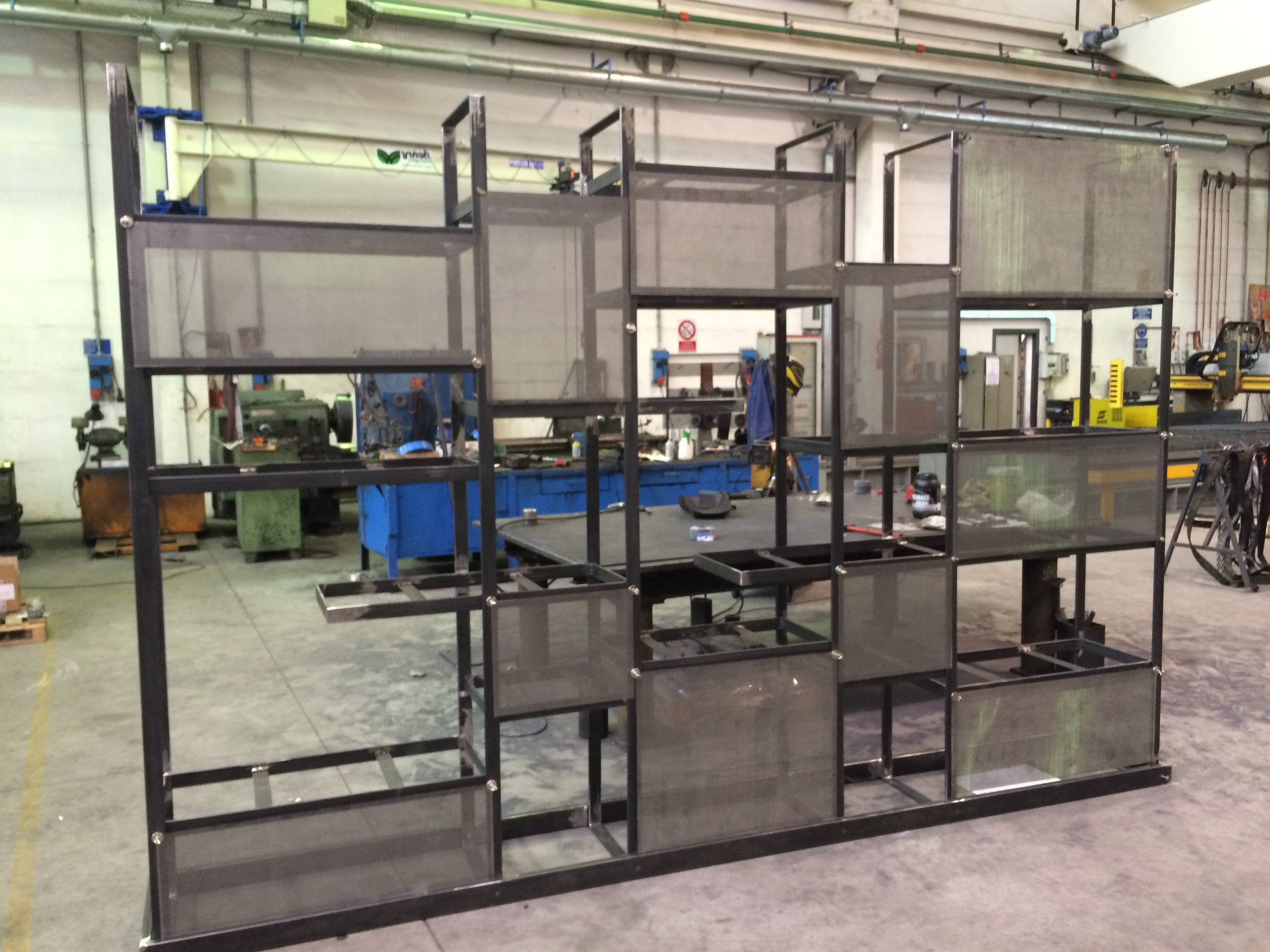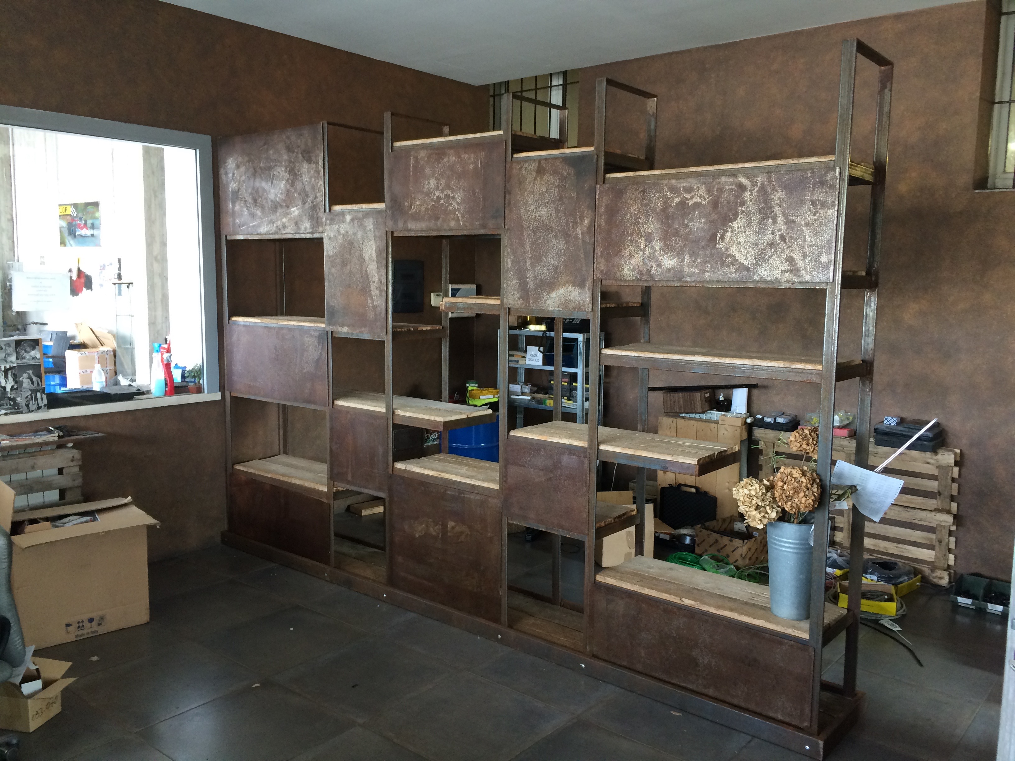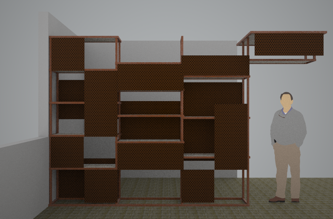Since the bookshelf is huge it was necessary to make it modular: It resulted in a 4 pieces modular frame + 21 wood boards. Installation was fast and easy! Moreover all the rusty perforated metal panels are movable since they are placed through magnets.