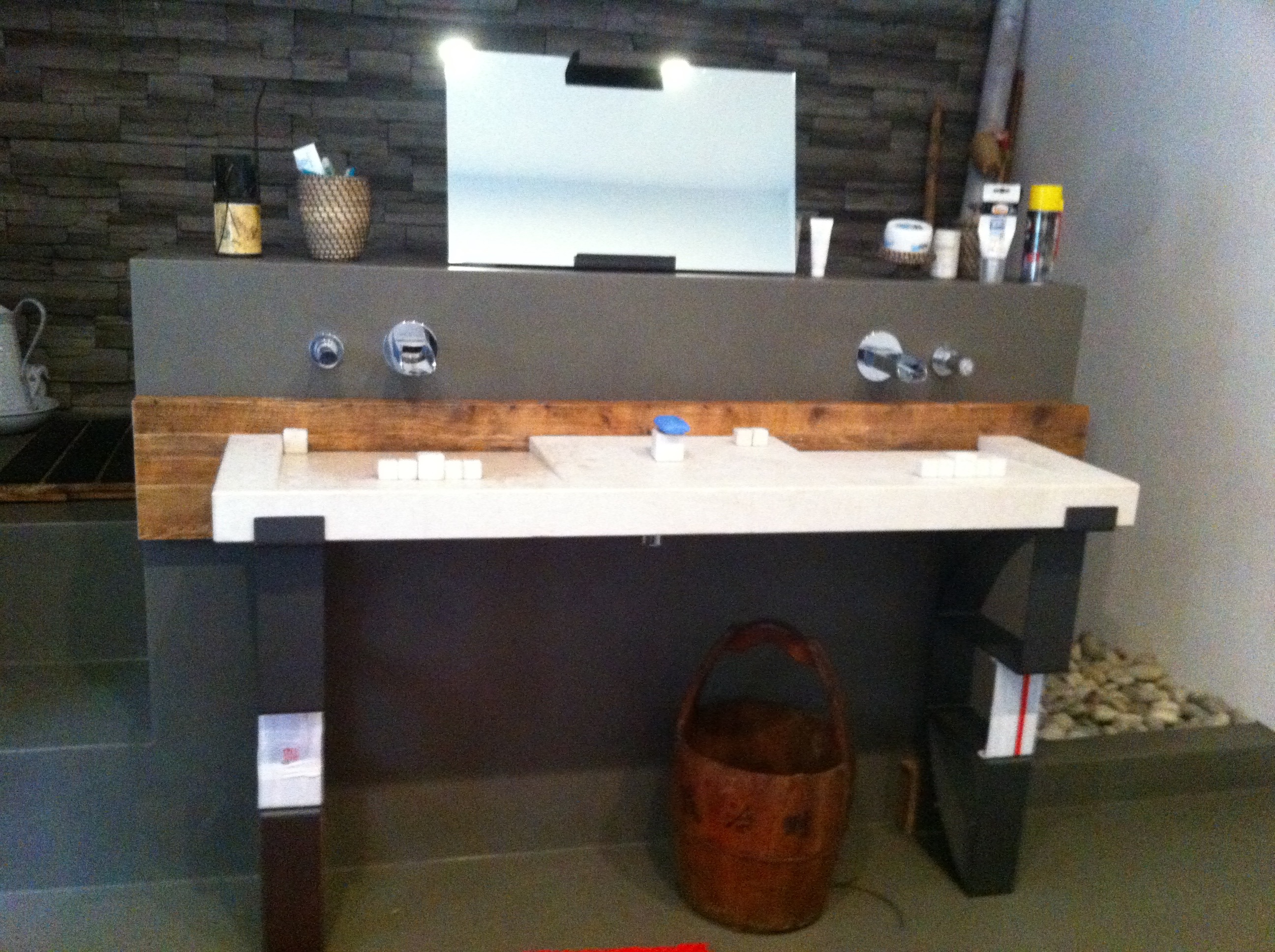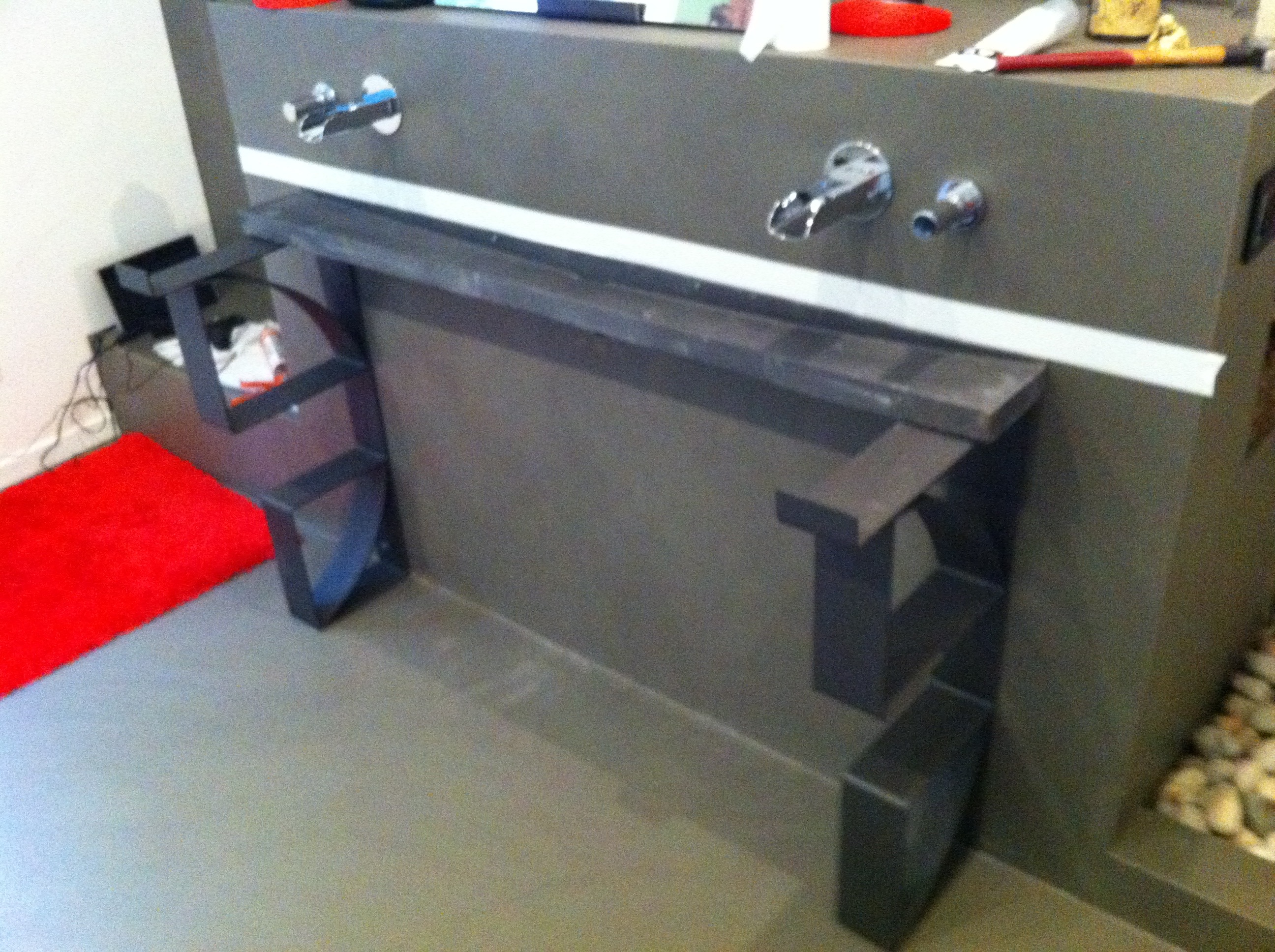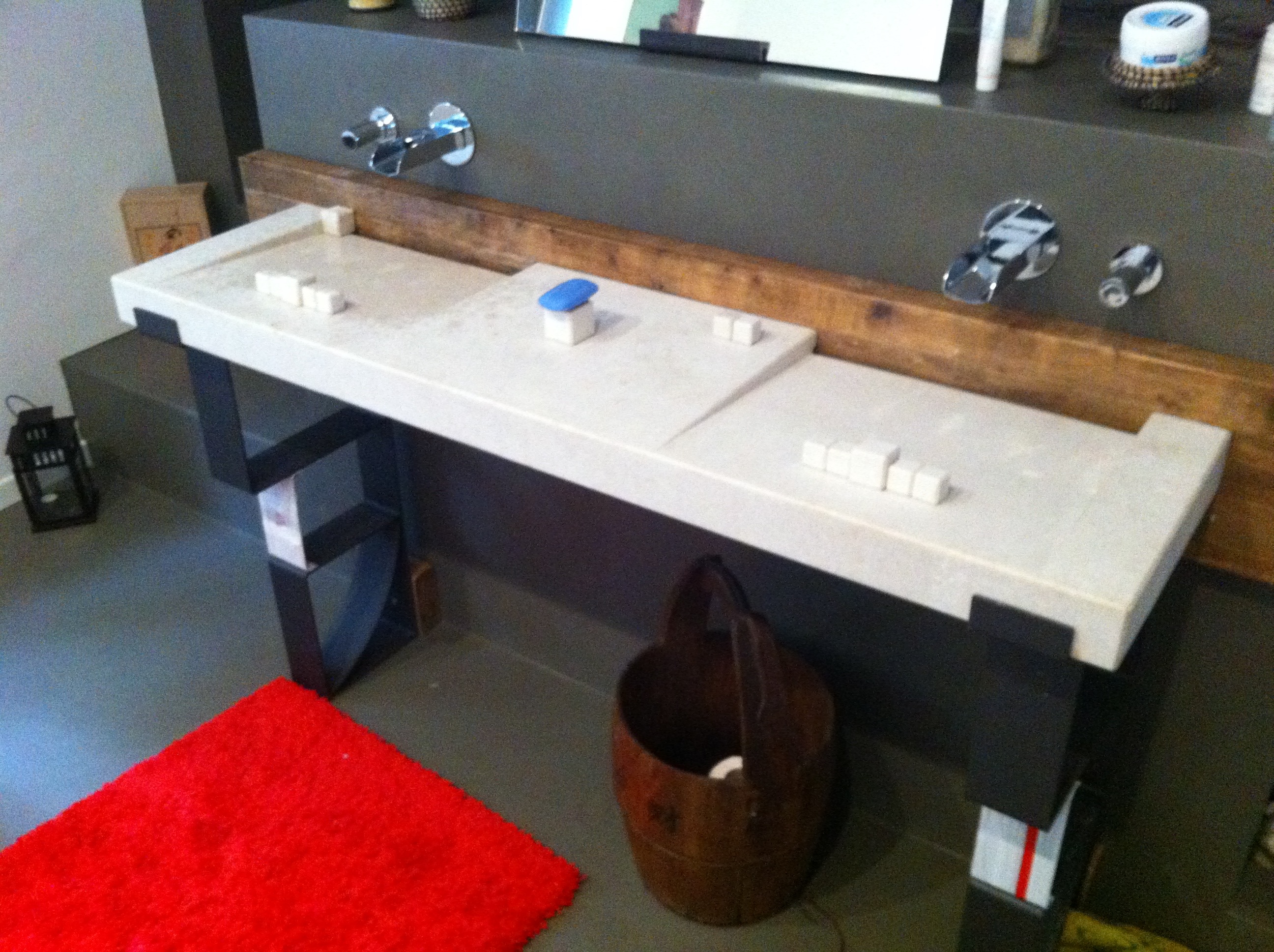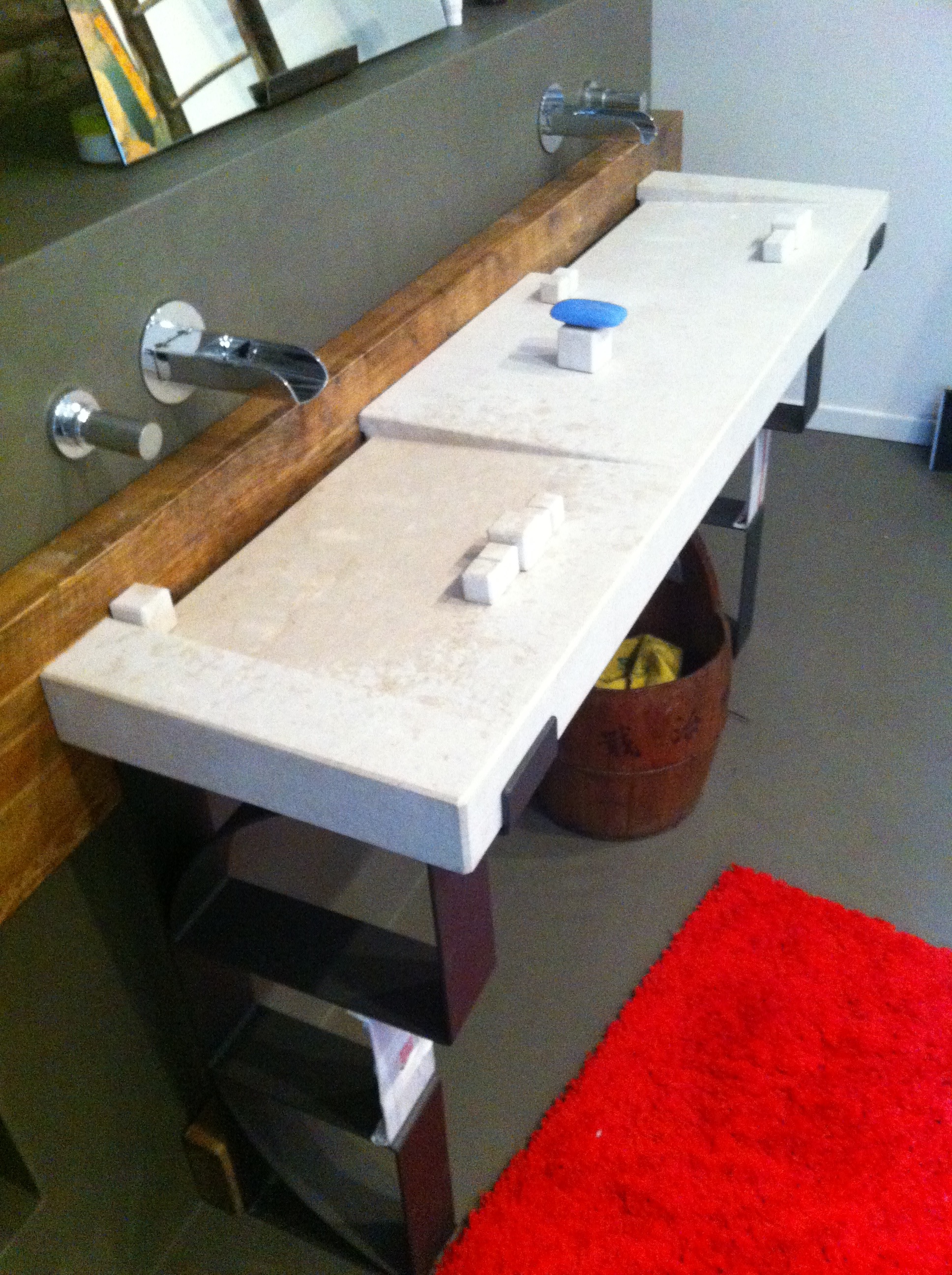 The waterfall style faucets were not the perfect match for this sink. Since the depth of the sink is short, the water jets out. I solved this problem fixing a line of marble cubes as dam. I love this solution!