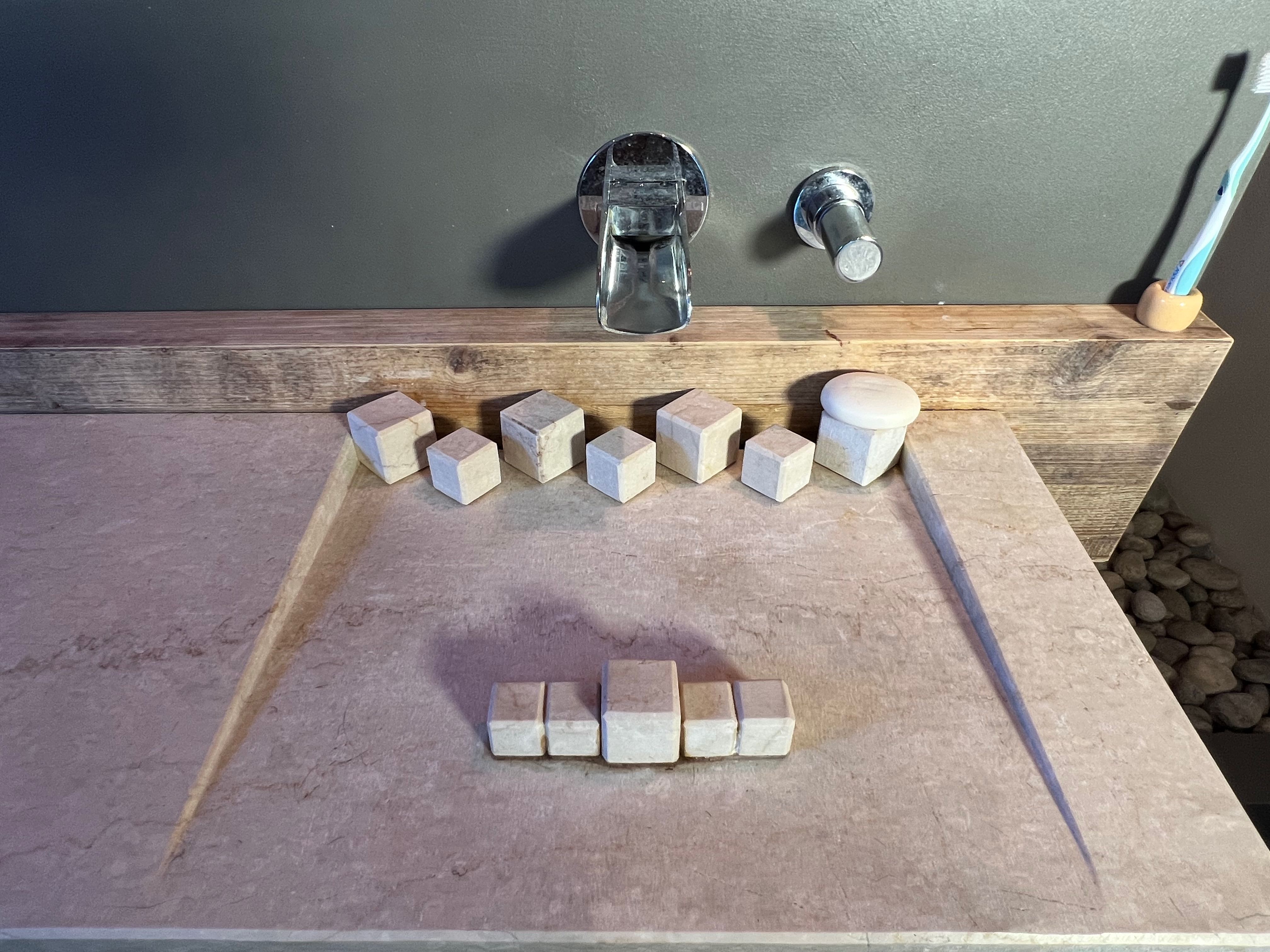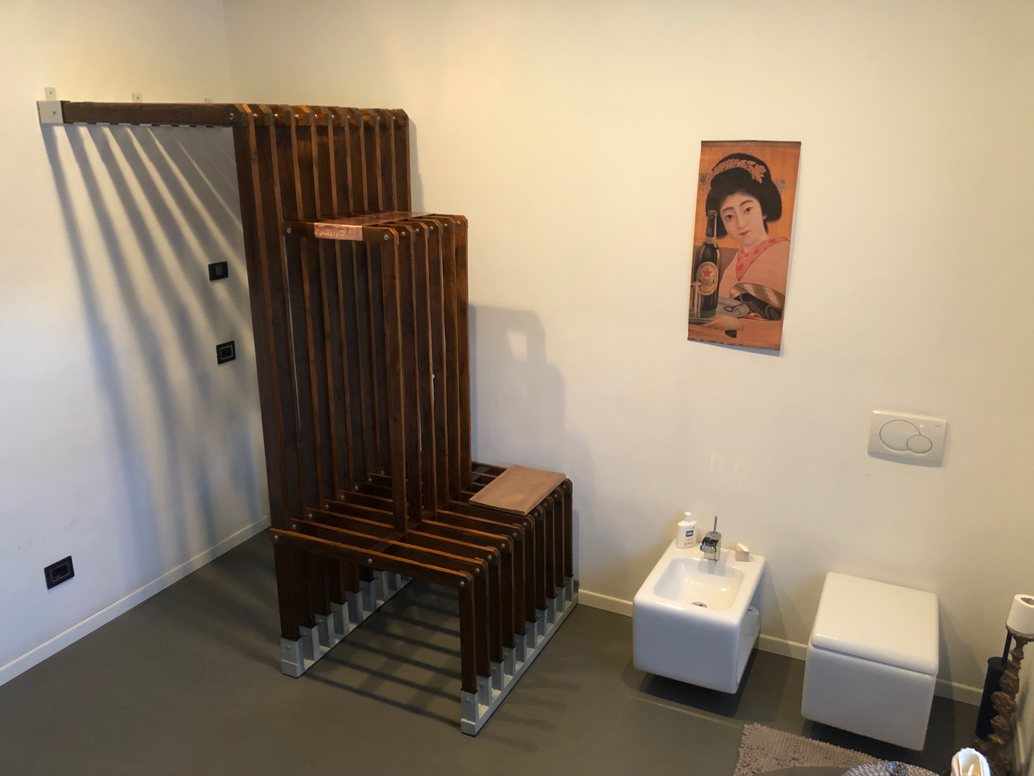 Lot of wood and marble and pieces coming from oriental countries lie down on a gray resin surface. The marble basin structure hides a wide rectangular bath tub and shower, perfect spot for fast or slow bath time, single or in couple. Or more…