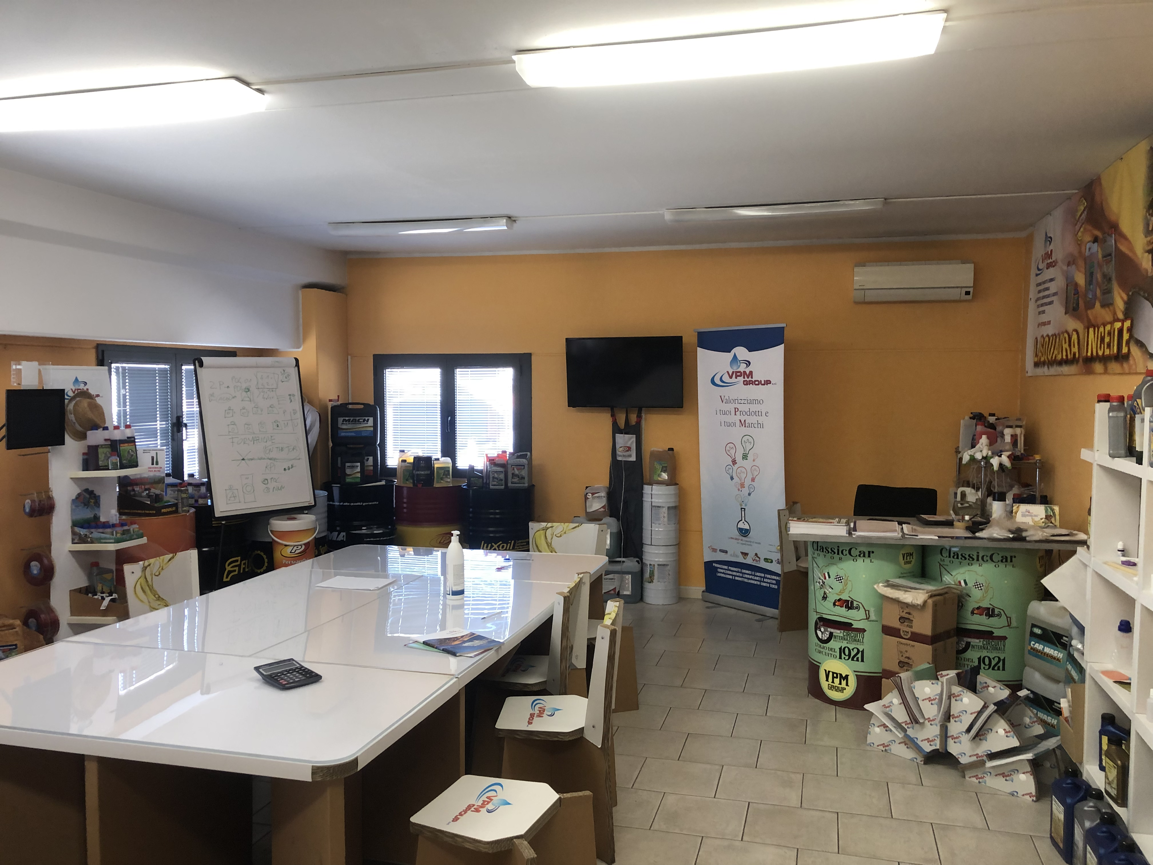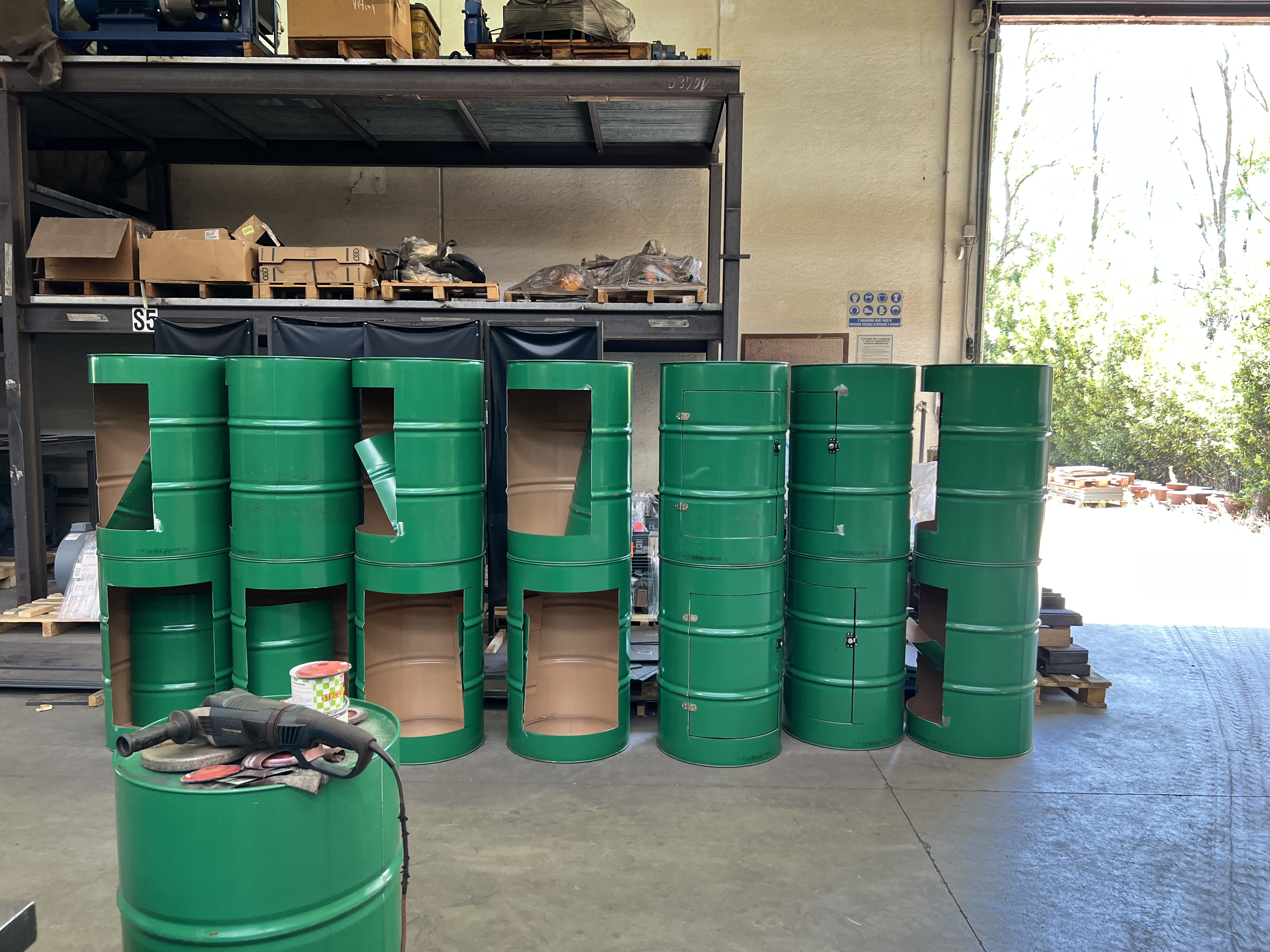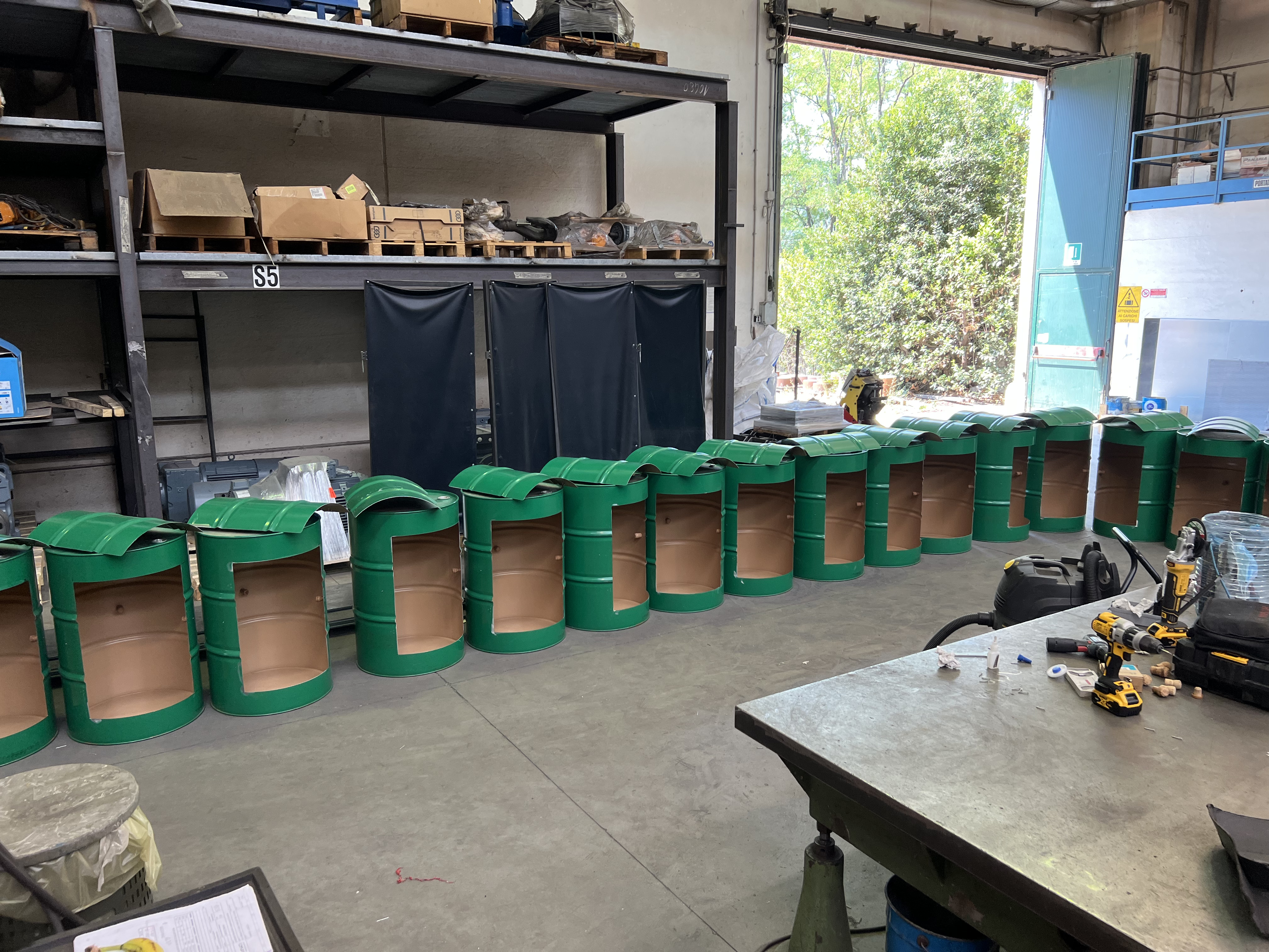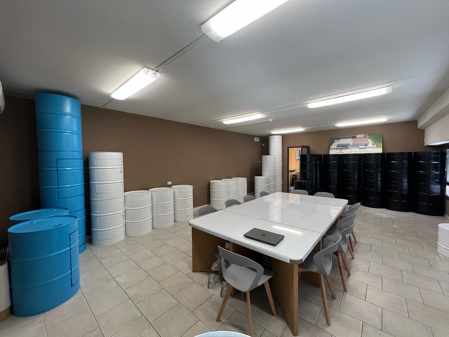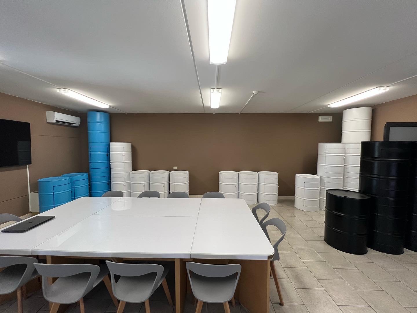 Since VMP Group produces and distributes oils and lubrificants for motor vehicles, I thought that using oil barrels to bring some order would have been coherent, cost efficient and fun. And here it is the new meeting room!