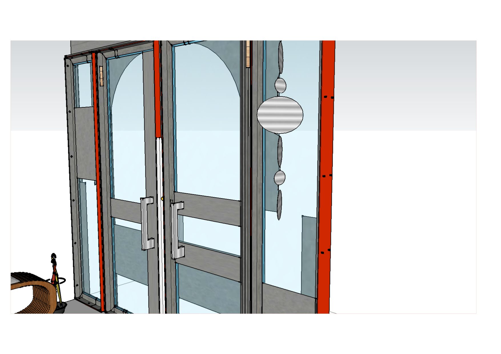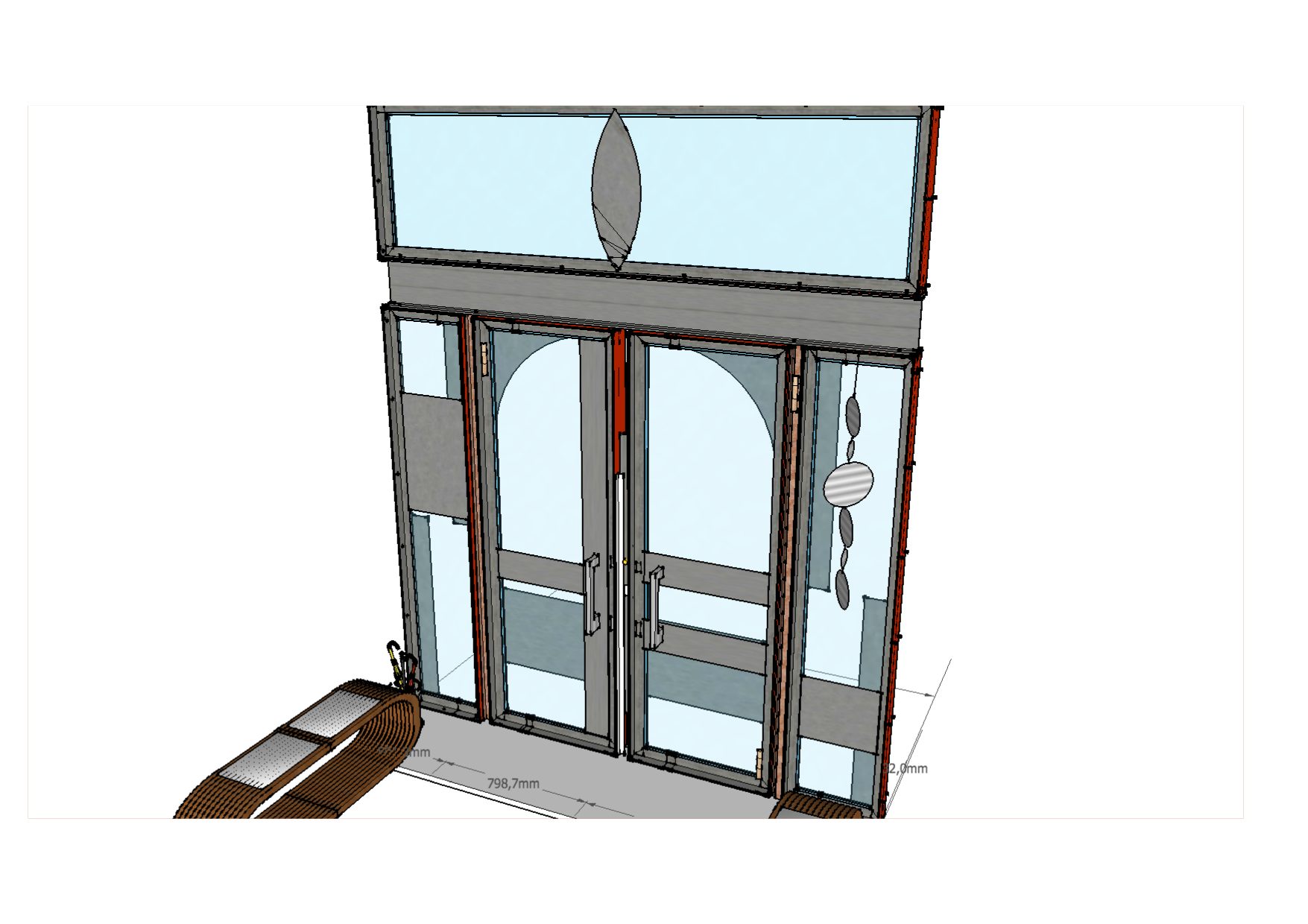 I wanted it to look heavy and rustic, therefore I copied the original door shape and recreated it with transparency (to have the outside rustic view insight and, viceversa, the rustic interior view outside) and broad iron plates to recall wood beams.