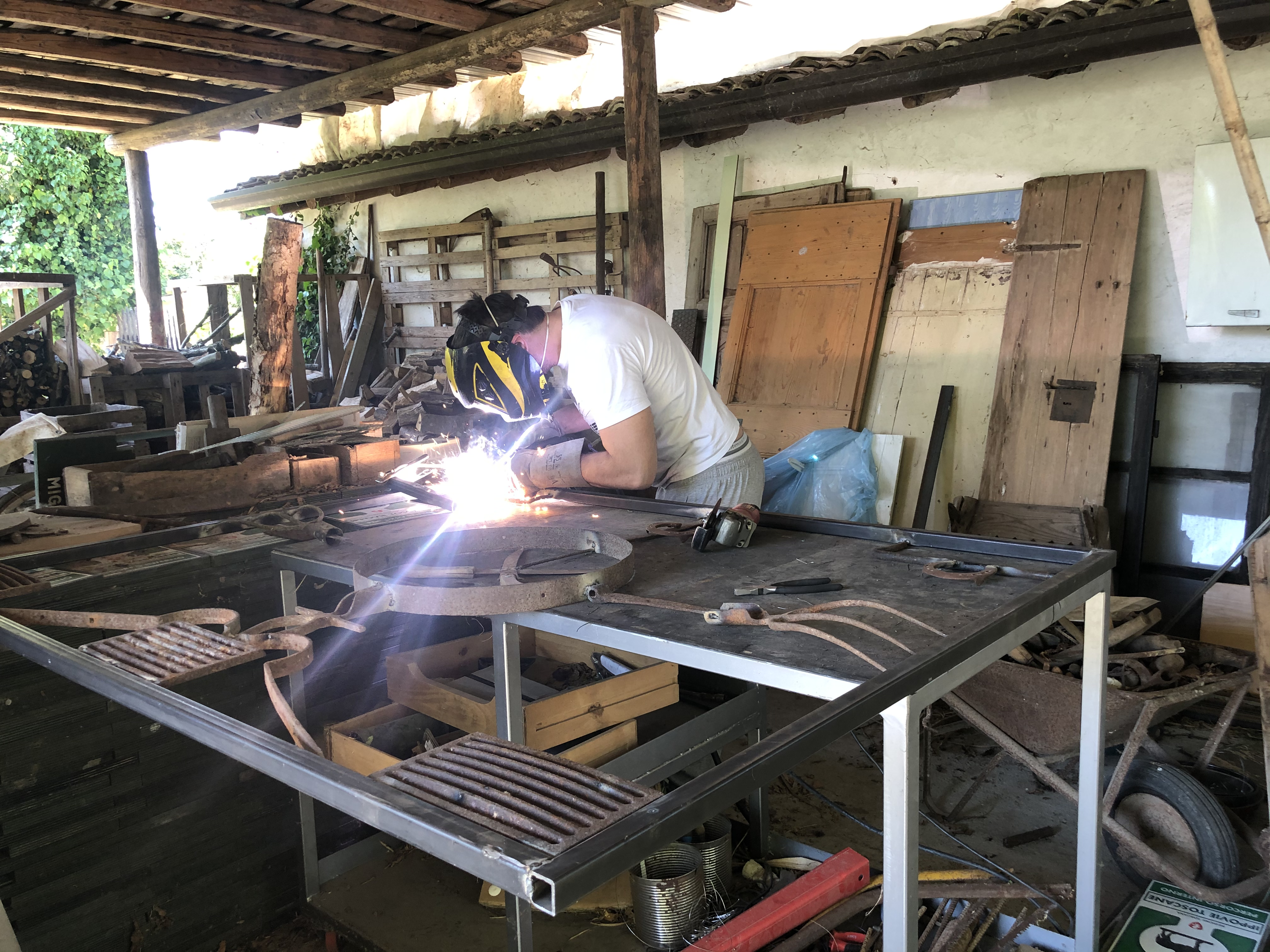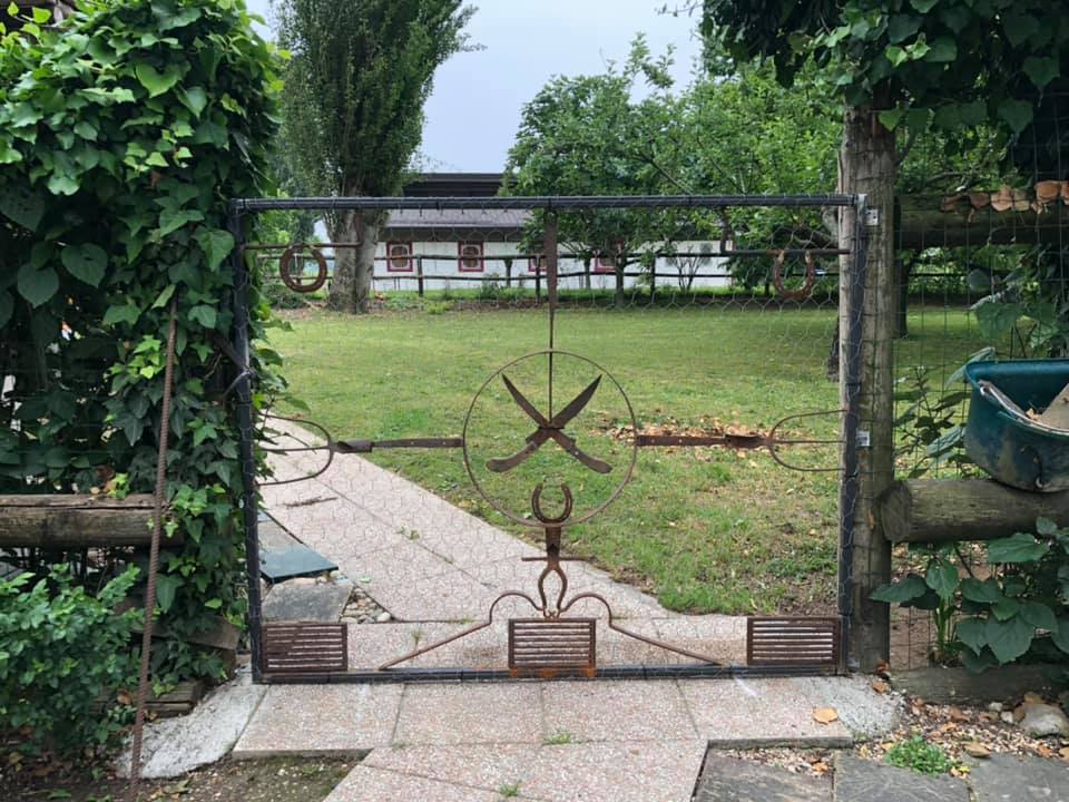 A country house is usually populated by people and animals. Among animals there are predators (like jack russell terriers!!!) and preys (hans, chickens, geese, rabbits…). In order to avoid unexpected meetings I was asked to divide an area of the property. When I saw in the horse stable all the unused old farmer’s tools I got the idea for this gate.